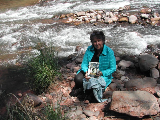 Barb sitting where Elsie might have sat beside the creek to read Poetry